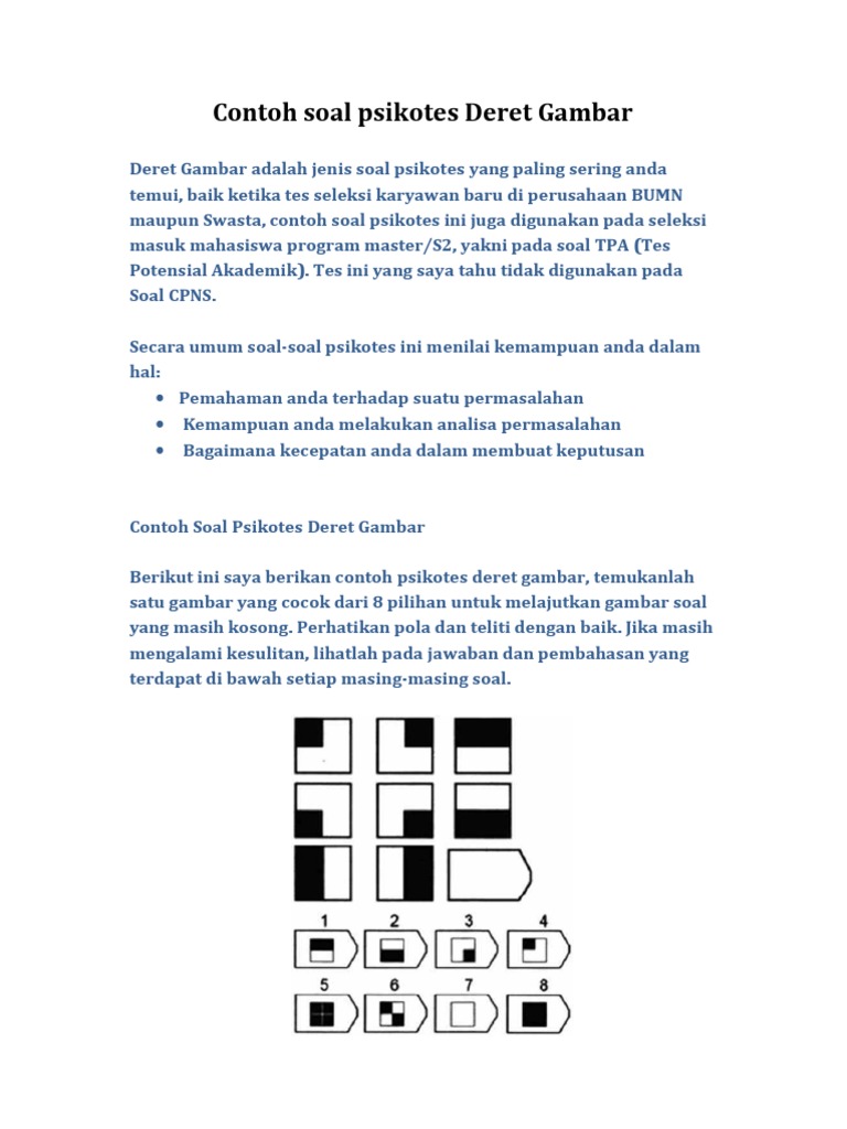Contoh soal psikotes deret gambar dan jawabannya adalah salah satu bagian penting yang wajib anda kuasai supaya anda sukses di dalam menempuh tes psikotes yang akan datang. Savesave psikotes deret gambar for later. Psikotes deret gambar dan jawabannya. Fungsi psikotes (tes psikologi) adalah untuk mengetahui keadaan emosional, motivasi, bakat, kecerdasan, dan sikap seseorang dalam. Untuk mengerjakan tes ini, diperlukan ketelitian yang cukup tinggi karena soal demi soal saling berkaitan satu sama lain. Soal psikotes gambar adapun tes gambar (spasial/ruang) ini memiliki 5 jenis soal.