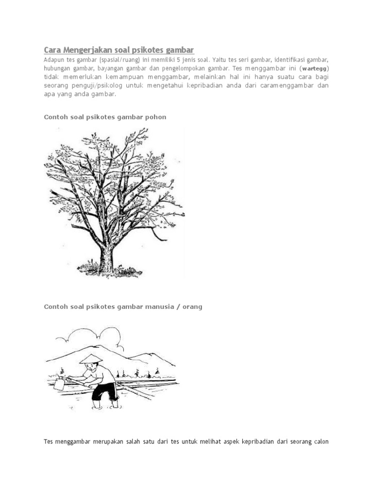 Psikotes gambar pohon sering di gunakan oleh perusahaan untuk mengetahui karakter calon karyawannya.dalam menggambar. Download now penjelasan dan contoh tes psikotes menggambar orang beraktivitas. Tujuan tes menggambar pohon atau baum test adalah untuk menilai karakter kepribadian dengan cara menganalis gambar pohon yang dibuat oleh peserta tes. Tips lulus tes psikologi gambar rumah, pohon dan orang, contoh mudah dan sederhana tes gambar psikologi untuk latihan. Cara mengerjakan tes menggambar pohon (baum test) pada tes psikotes dunia kerja serta contoh gambar pohon.