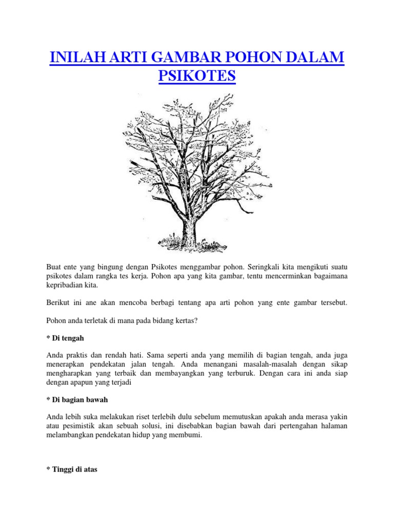 Kedua, buat lah gambar pohon tersebut secara proporsional di bagian tengah kertas dan perhatikan ukuran gambar tersebut. Batang pohon yang ramping mempunyai arti bahwa anda termasuk orang yang fleksibel dan terbuka dengan. Kan sudah ada tes gambar orang dan pohon? Tes psikotes gambar adalah salah satu jenis dalam tes psikologi. Contoh soal tes psikotes gambar seperti bentuk menggambar 8 kotak,tiu 5,gambaran gir,orang,pohon,ataupun wartegg adalah jenis pertanyaan yang paling sering diujikan dan keluar saat proses seleksi baik untuk anda yang lulusan sma ataupun lulusan yang lainya.anda harus.