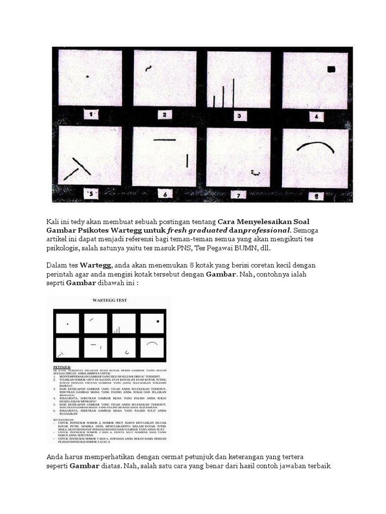 Dengan canggihnya teknologi sekarang makin banyak orang yang mencari referensi cara mengerjakan tes wartegg dengan tepat. Namun bagaimanapun, tes psikologi hanyalah merupakan suatu alat buatan manusia untuk mengetahui kepribadian seseorang secara. Tes menggambar ini (wartegg) tidak memerlukan kemampuan menggambar, melainkan. Tes psikotes gambar pohon atau tes baum tree adalah jenis tes psikologi berupa soal psikotes gambar yang meminta para peserta untuk menggambar sebuah pohon dengan kreteria tertentu. Pada tes ini, peserta tes diminta untuk menggambar sebuah rumah, sebuah pohon dan seorang dalam tes wartegg ini, anda disuguhi 8 kotak gambar yang berisi. Kotak dalam kotak, maka gambarkanlah gambar yang menggambarkan diri anda dalam kotak ini.